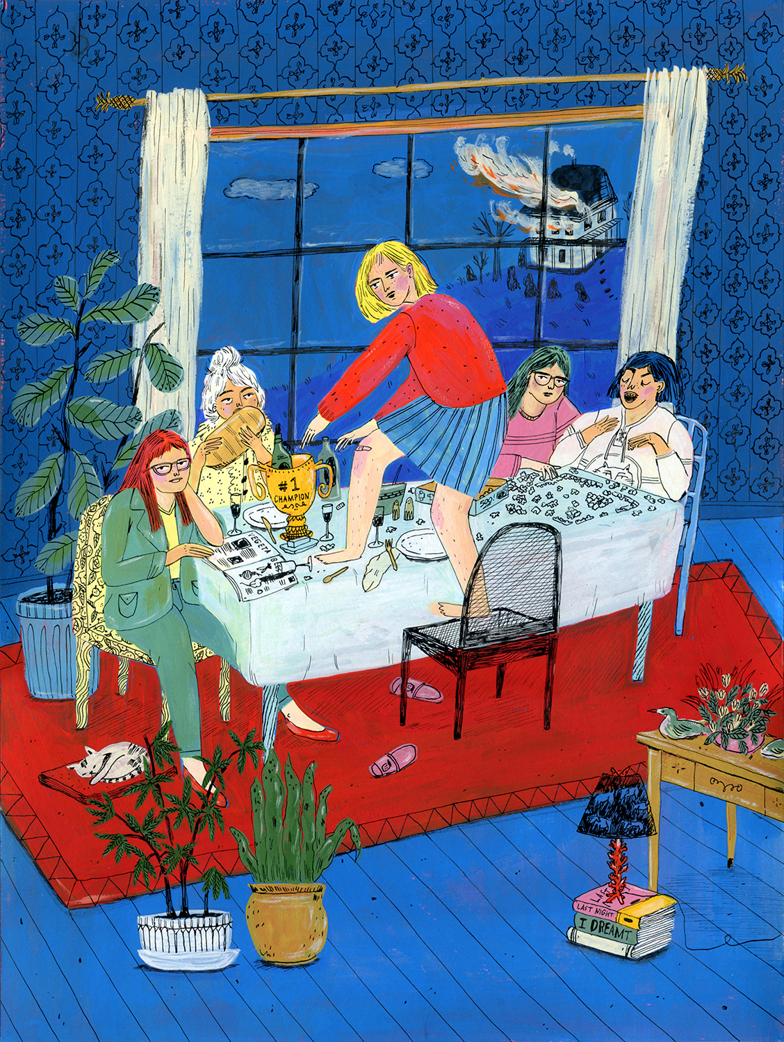 Jill is an artist who paints people in mundane moments in lush interior spaces.Through rich imagery, Jill hopes to convey the lavishness of life, the peacefulness of a moment alone with a book and a snack, the warmth of friendship, and sometimes the dark weirdness of being alone in the modern world.